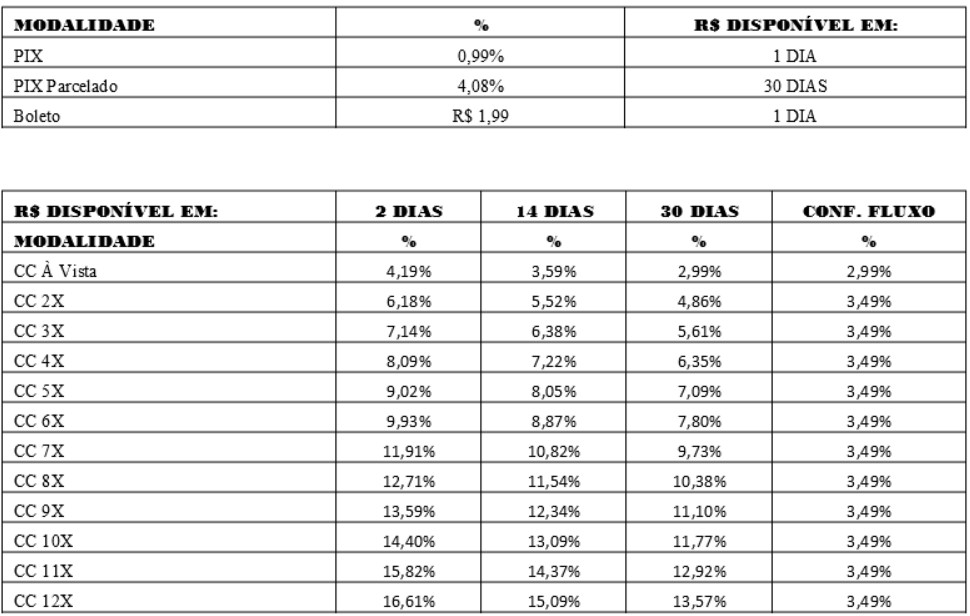 13.9 O valor líquido ficará disponível para saque respeitando o prazo de repasse estipulado na tabela de preços, sendo que na modalidade cartão de crédito respeitará a opção de recebimento escolhida pelo cliente no momento da adesão da funcionalidade.